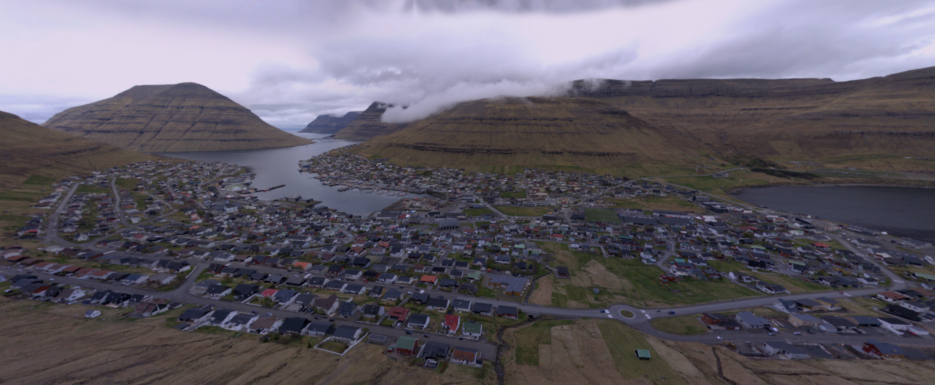 From this elevated position, you can take in the entirety of Klaksvík and its surroundings. The town is nestled snugly between the fjords, with colorful houses dotting the landscape. The sparkling waters of the Atlantic Ocean frame the picture, and the rolling hills and majestic mountains provide a stunning backdrop.